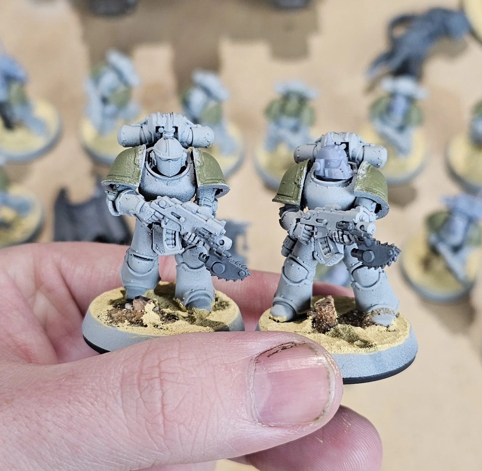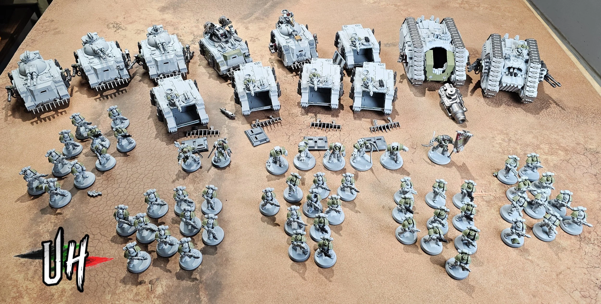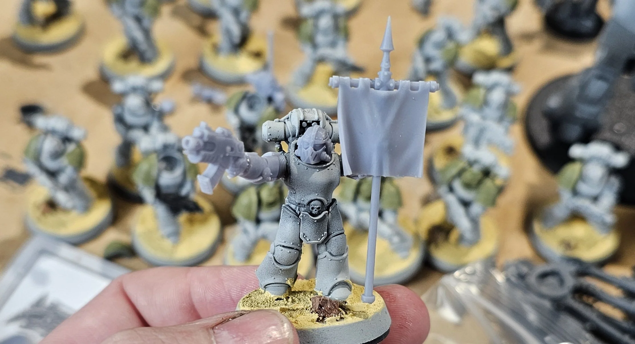 The vehicles had all their tracks added, their exhaust stacks pinged off (Ease of painting), marines adjusted and tweeked and assigned to their squads and all the pintle weapons on the vehicles removed. Printing involved heads to spice up the infantry, replacement hatches for the cupolas that needed them and the all important Vexilla and Voxes, that came out absolutely mega. These are not only really useful to keep your squads in play, but they add so much flavour to the army, I’m glad I decided to add the effort in to them. Once that was done, I built the Leviathan Dreadnought, the Spartan and the Centurion. Once everything was printed, built, repaired and completed, I added texture to the bases ready to paint once the units are set and painted. I do this to stop that awful ‘lul’ period when you finish painting something, and then apply texture to bases and wait forever for it to dry. Proper painting buzzkill! Doing this now doesn’t slow you down later.